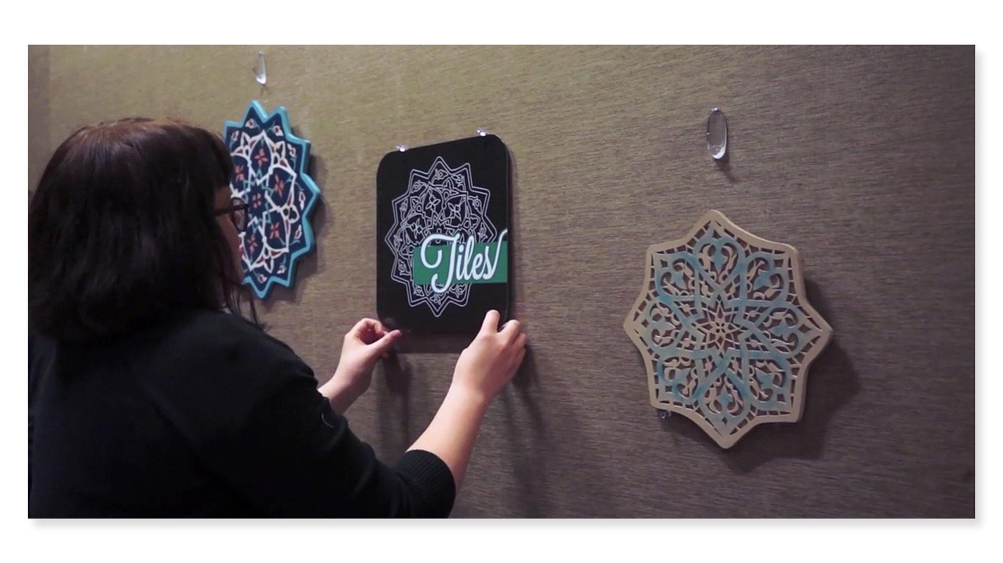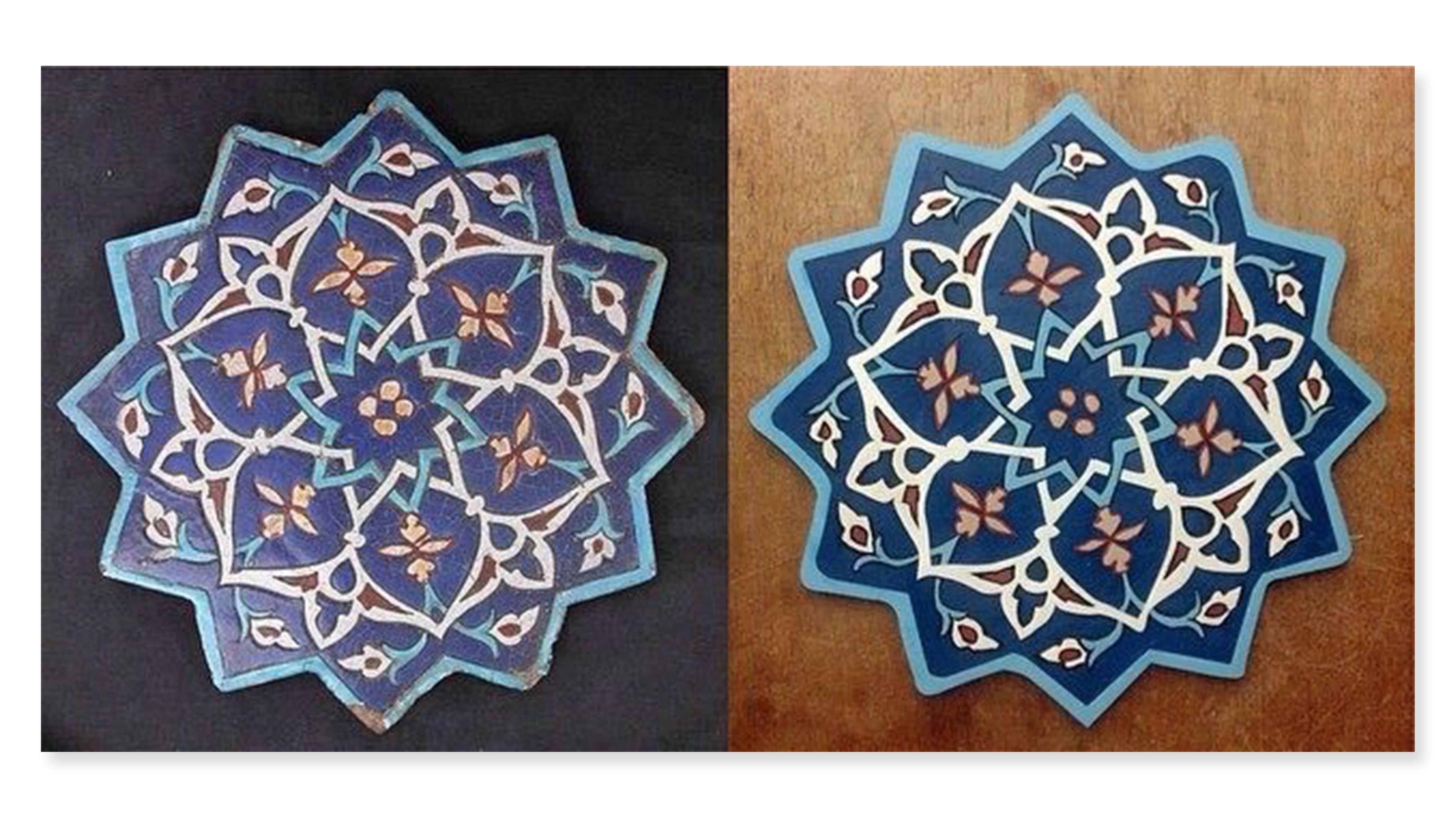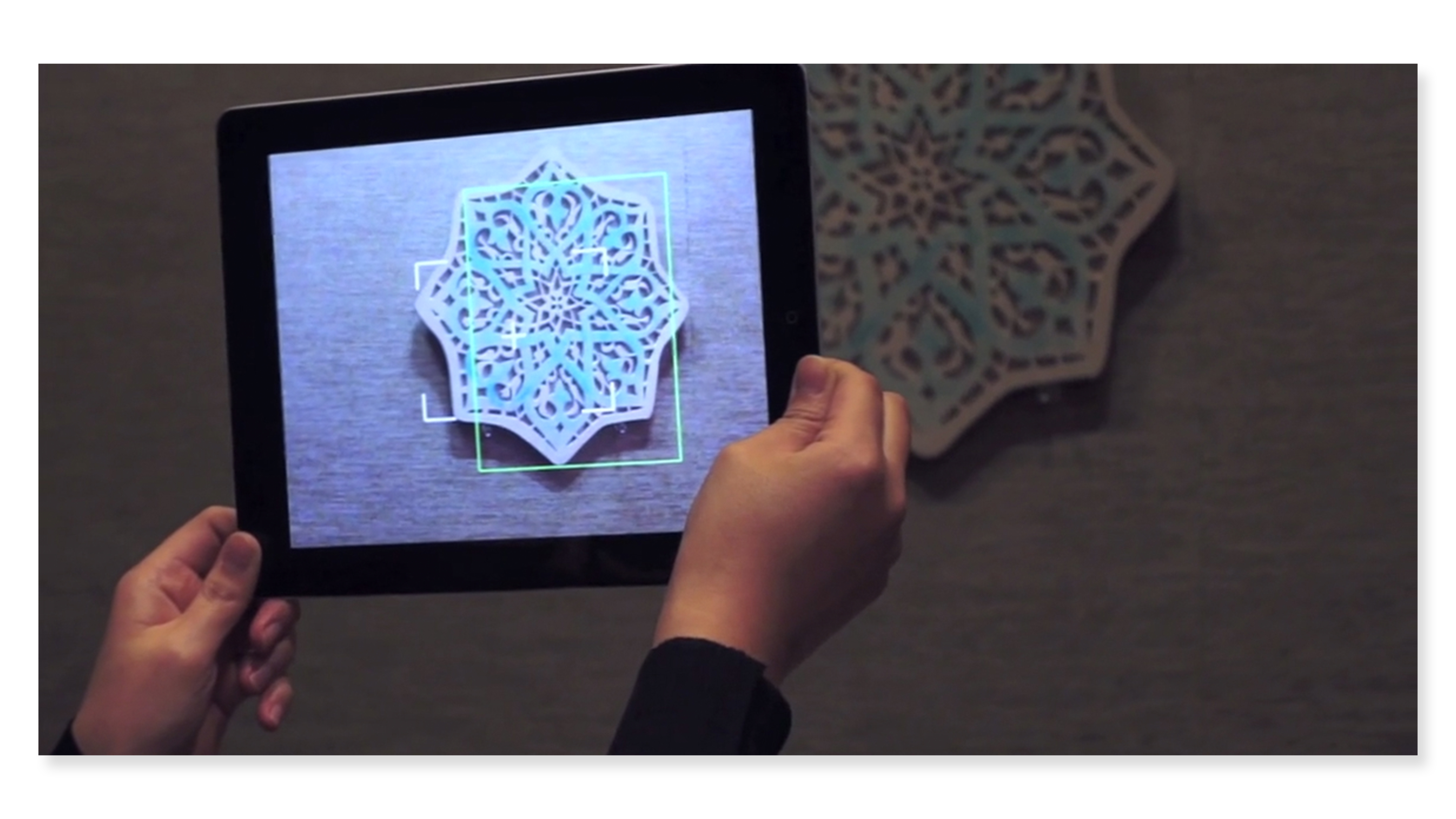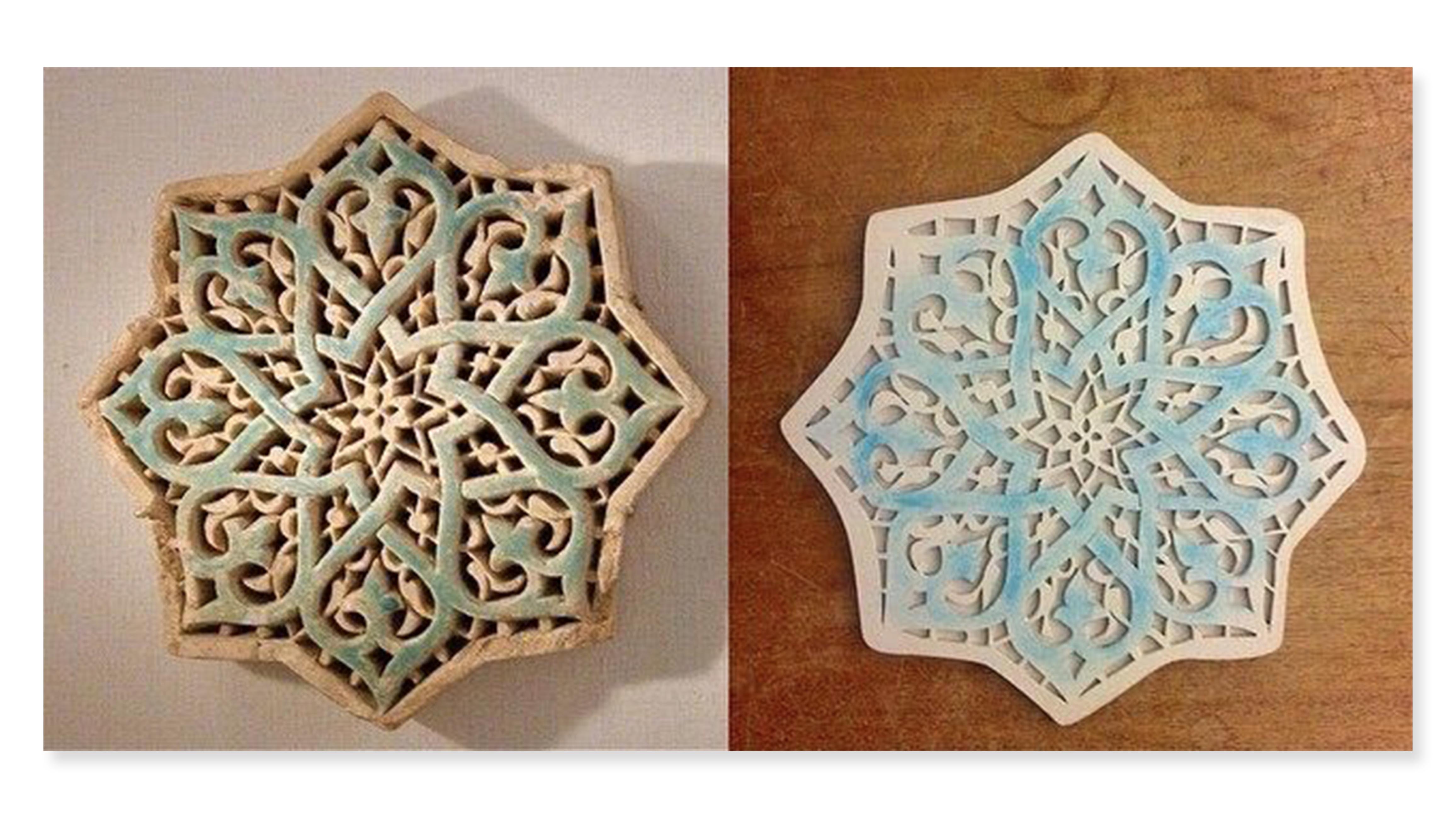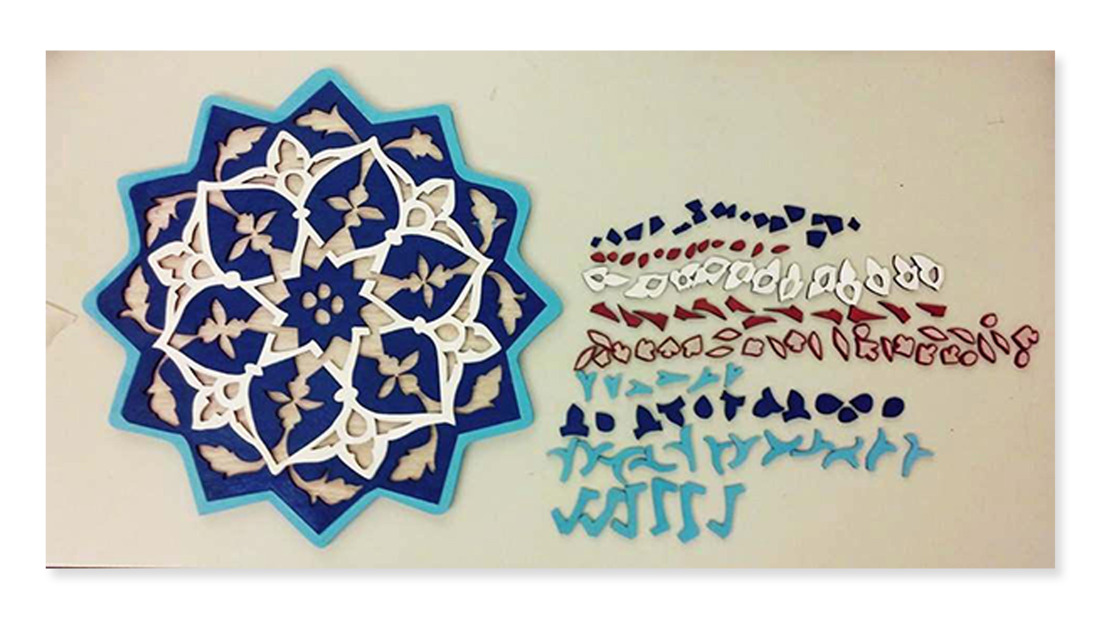 We knew we were not able to initially test our prototype with the gallery space itself, so we meticulously laser-cut the Carved Star Tile and the Twelve-Pointed Star-Shaped Tile found in the department's collection. To cut these tiles we took hi-res images of the stars provided by the Met and Sarah traced over their patterns in Illustrator. The iPad would then use object recognition to recognize our tiles.